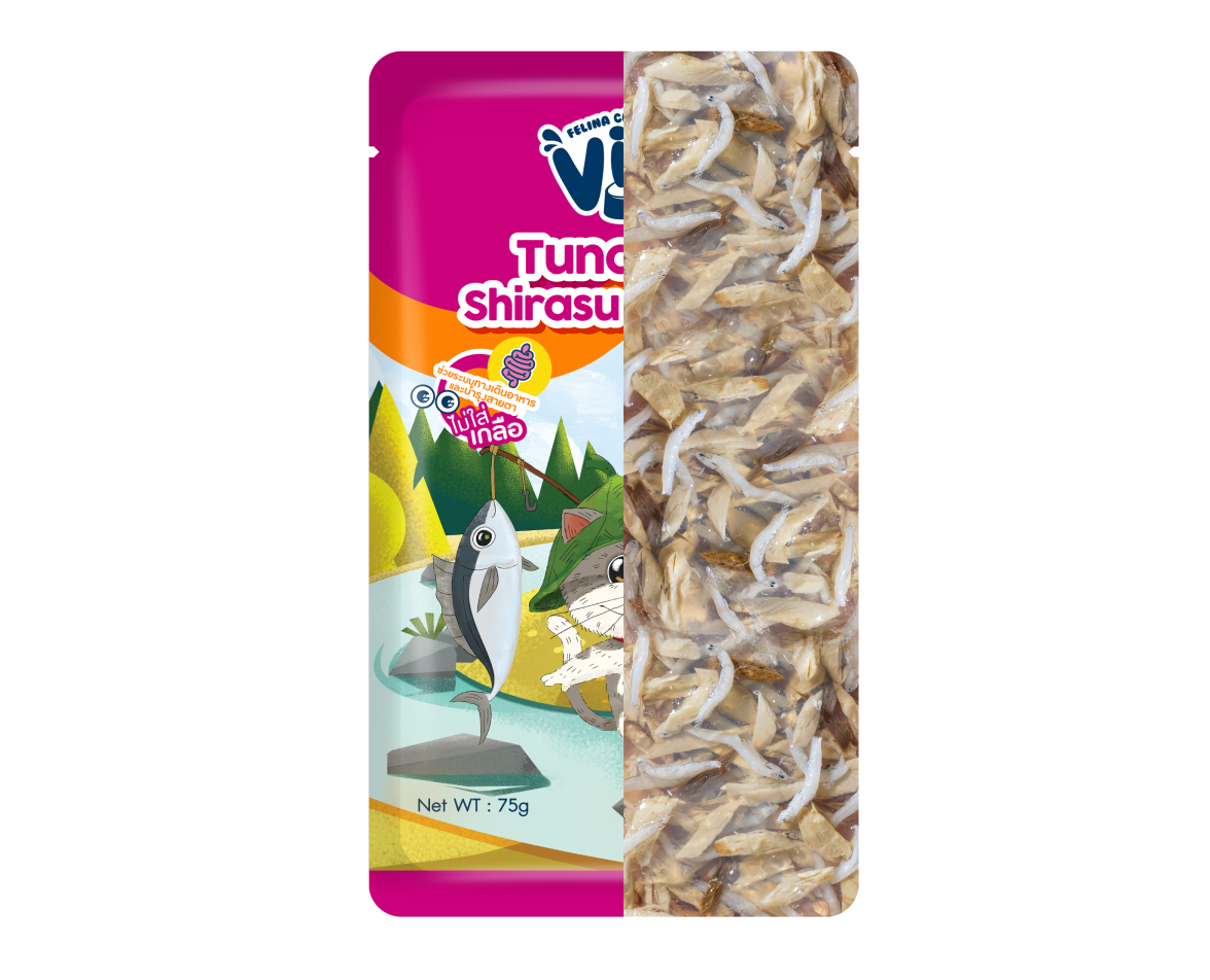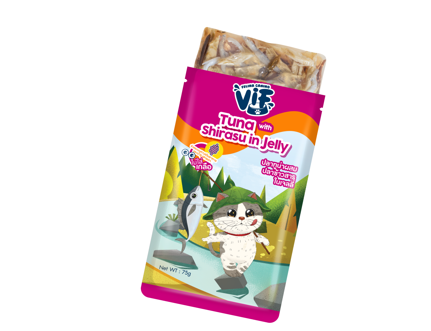 ผสมผสานระหว่างเนื้อปลาทูน่ารสชาติเข้มข้นกับปลาข้าวสารสัมผัสกรุบกรอบ อยู่ในรูปแบบเจลลี่เนื้อเนียนนุ่ม อิ่มอร่อยได้แม้ไม่มีการผสมเกลือและสารกันเสีย เสริมด้วย วิตามินอี โอลิโกฟรุกโตส และทอรีน ช่วยให้การทำงานของร่างกายแข็งแรง