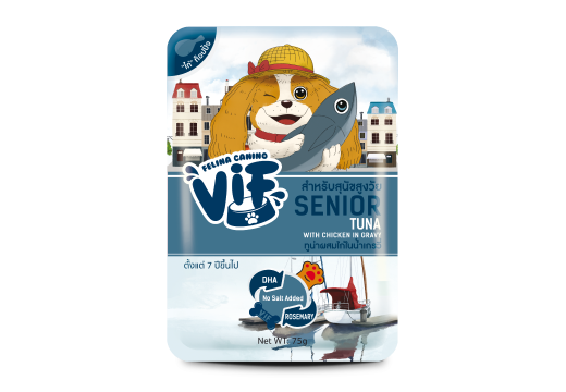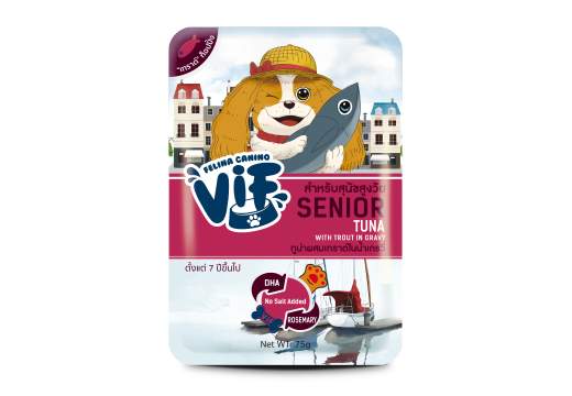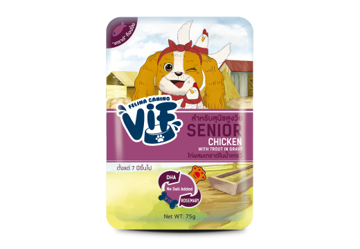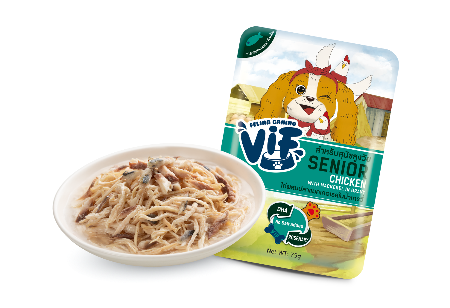 เนื้อไก่แน่นนุ่มผสมผสานกับเนื้อปลาแมคเคอเรลรสชาติเข้มข้น ในน้ำเกรวี่หอมอร่อย ทานง่ายเหมาะสำหรับสุนัขสูงวัย อีกทั้งมีการเสริม DHA และสารสกัดโรสแมรี่ สารอาหารที่ช่วยส่งเสริมสมดุลการทำงานของร่างกายให้กับสุนัขสูงวัย ไม่ใส่เกลือและสารกันเสีย
