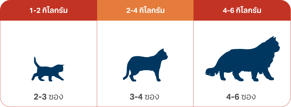 - ปริมาณอาหารปรับเปลี่ยนได้ตามความเหมาะสมของสายพันธุ์ น้ำหนัก และกิจกรรมของแมว