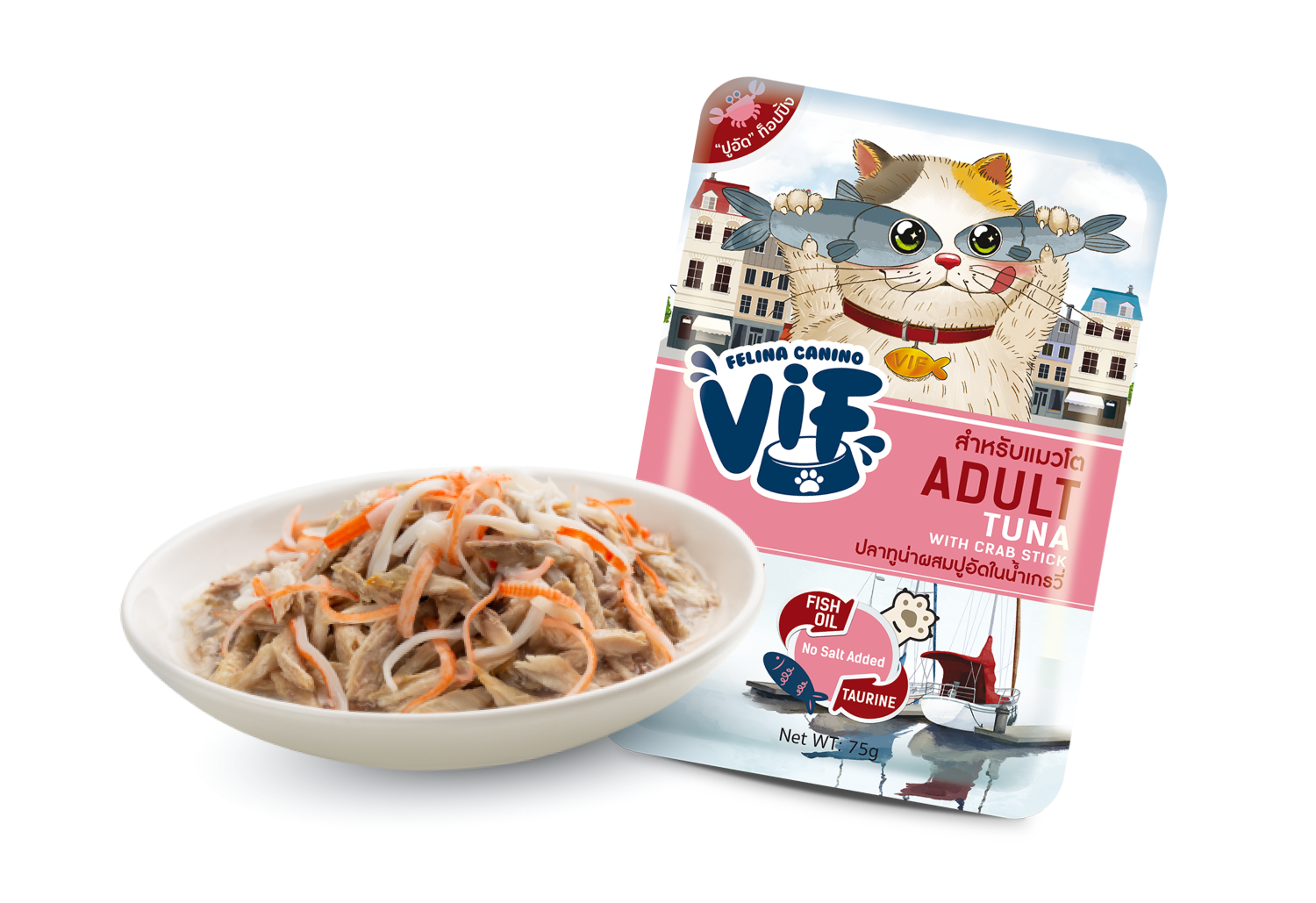 เนื้อปลาทูน่ารสชาติเข้มข้นผสมกับปูอัดในน้ำเกรวี่หอมอร่อย ทานง่ายเหมาะสำหรับแมวโตเต็มวัย เสริมด้วยน้ำมันปลา และทอรีน ที่ช่วยส่งเสริมสมดุลการทำงานของร่างกาย ไม่ใส่เกลือและสารกันเสีย